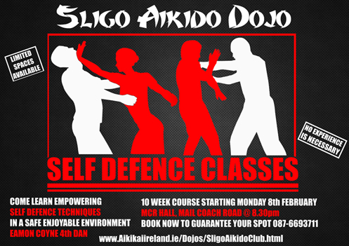 Sligo Aikido Dojo will be running a 10 week self defence program starting on Monday 8th of February at 8.30pm. The cost of the course is €10 per class or €75 in advance for the full course. Book early to avoid disappointment 087-6693711 or eamoncoyne@gmail.com.